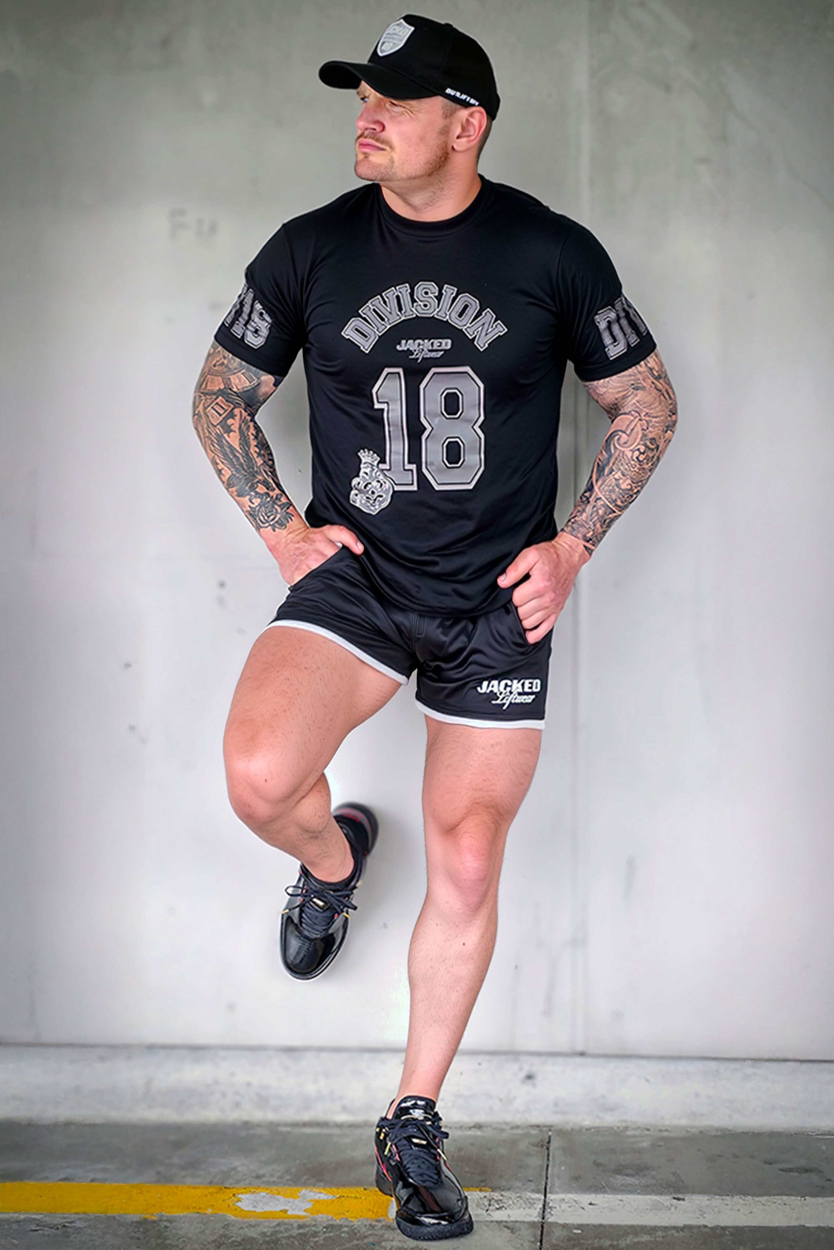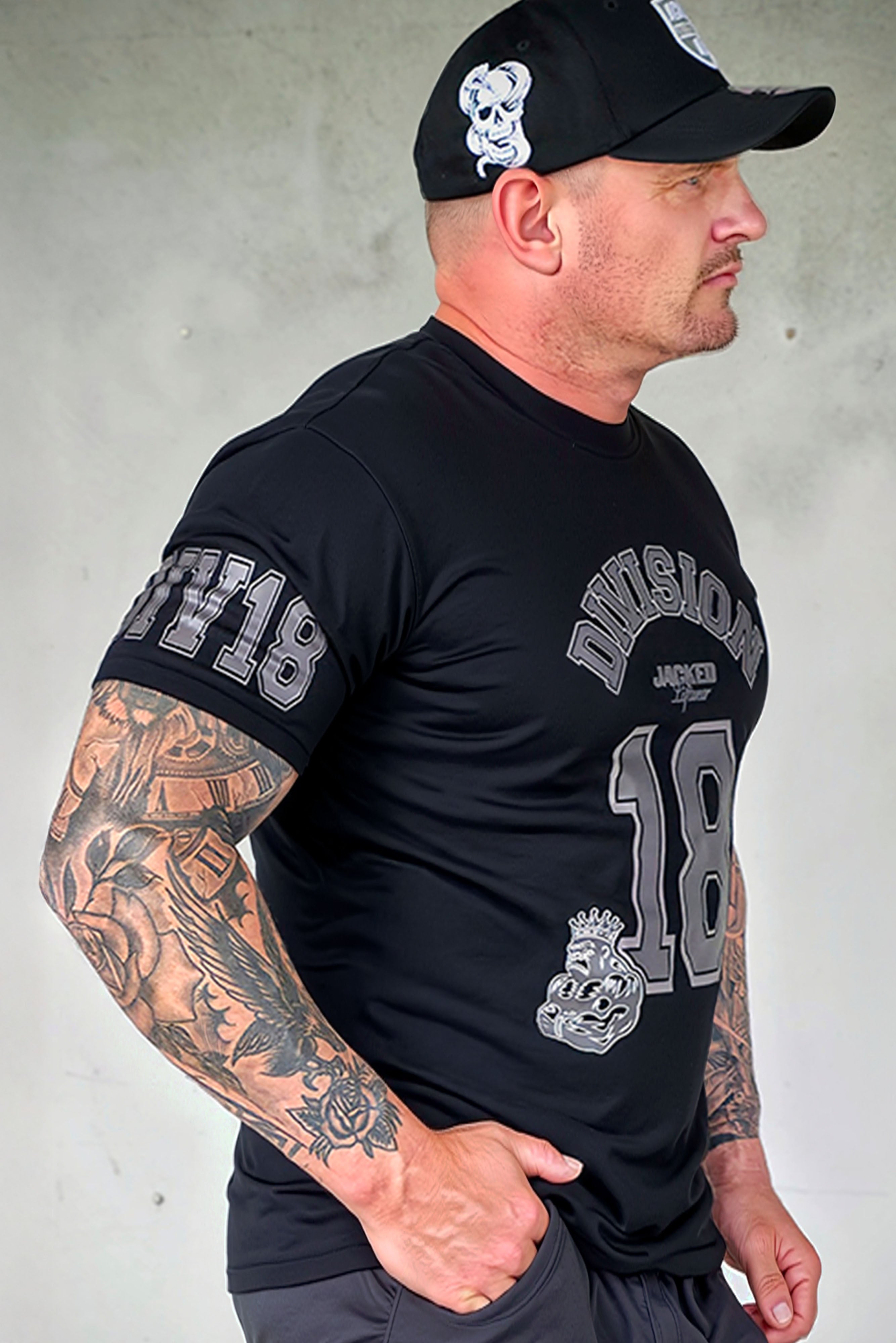 The JCKD Division 18  Stealth Tee represents the strength, grit, and relentless drive that are at the core of JCKD. Dominated by the bold “DIVISION 18” graphic, BLK on BLK and crowned Gorilla emblem, it’s a statement piece that holds its own in and out of the gym.