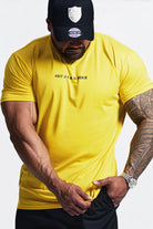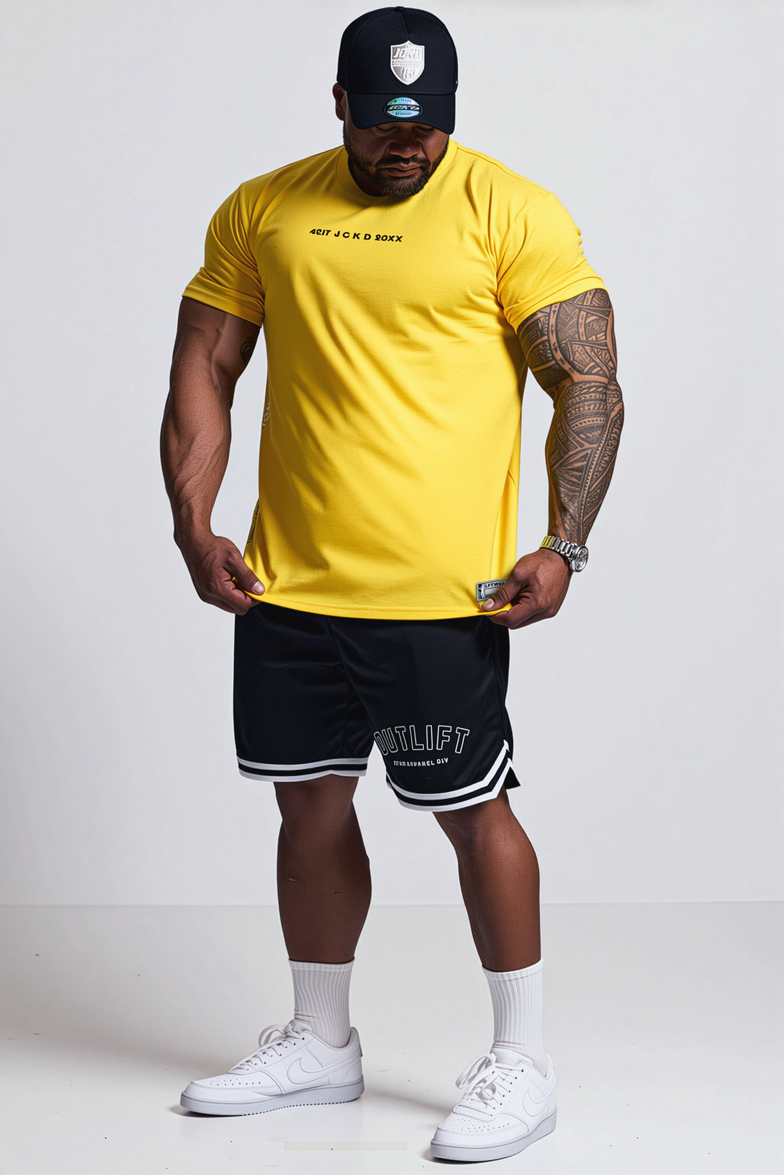 Cut from 220 GSM premium combed cotton, this tee is all about shape, breathability, and staying power. Side seams, twin-needle stitching, and shoulder-to-shoulder tape hold the line. Preshrunk for consistency, rep after rep. Available in Black with White print, or Yellow with high-contrast Black + White.